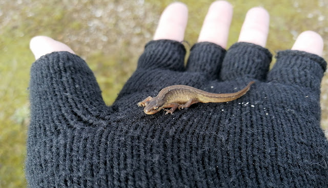 Due to the overnight rain and temperatures in excess of 10°C, large numbers of Smooth Newts were starting to make their way to the complex of ponds to the west of the track between the ARC Screen and the level crossing at the Affinity Water Works. You had to be careful not to tread on them and I must have moved over 30 from the track to, hopefully a safer location.